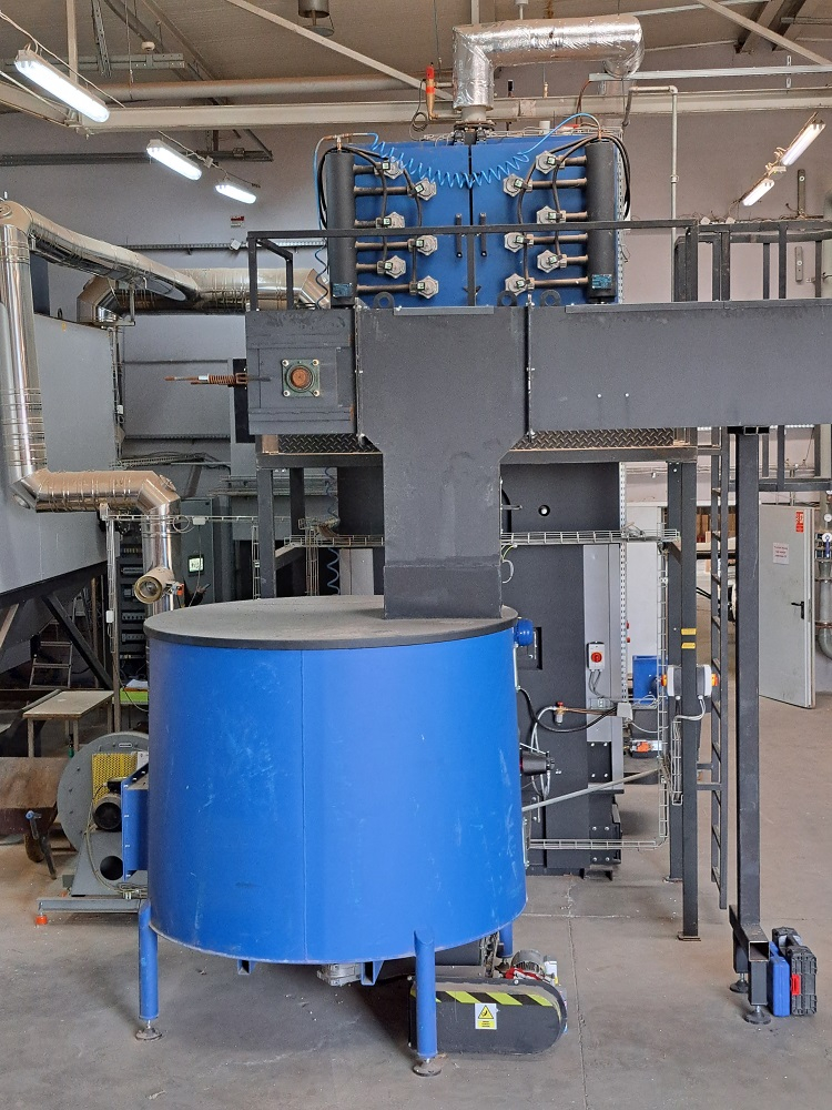 Ekomat RTPO z magazynem biomasy oraz walcowanym zbiornikiem. Grabie wygarniające, o maksymalnej długości 12 m, napędzane są siłownikami hydraulicznymi. Ich zadaniem jest transport paliwa z całej przestrzeni pomieszczenia do podajnika ślimakowego. Paliwo trafia do walcowanego zasobnika, skąd podawane jest do retorty usytuowanej w komorze spalania kotła.